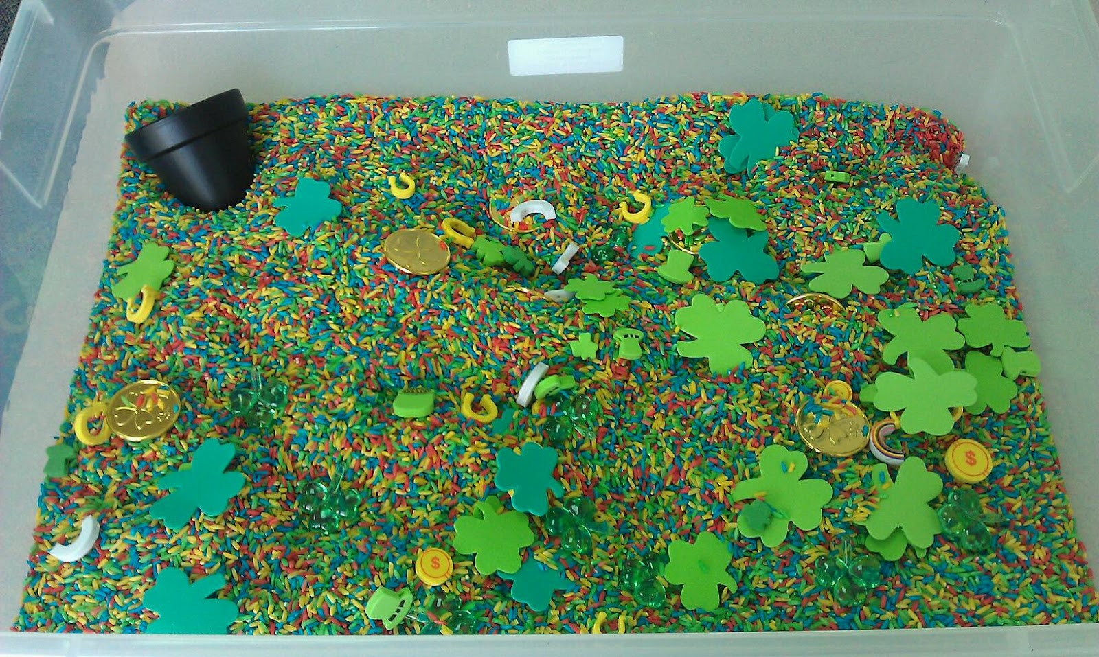 Our sensory bin this week is themed for St. Patrick's day. The first picture shows the items going into the tub. We had: a small clay pot painted black, foam St. Patrick's day beads, foam covers, gold coins, and plastic jewel shamrocks. The second picture is the bin assembled.